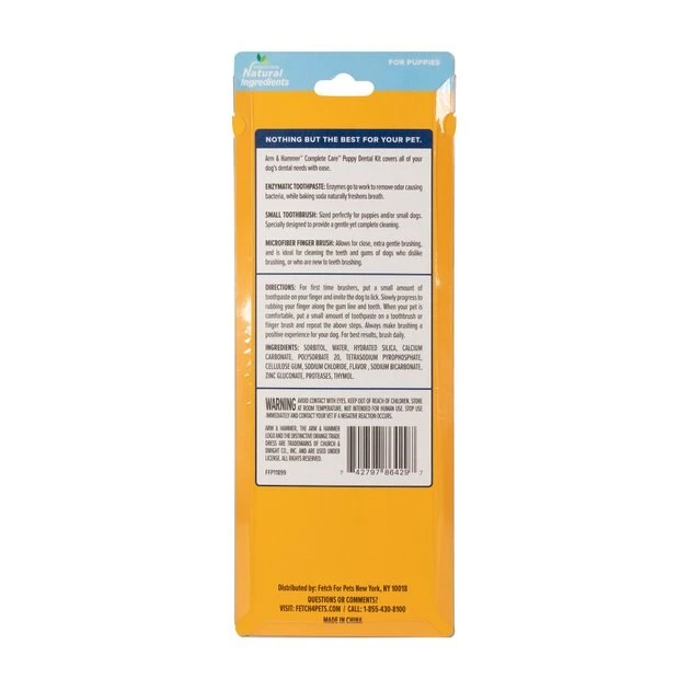 Begin a lifetime of healthy dental habits with the Arm & Hammer Complete Care Peanut Butter Flavored Puppy Dental Kit. This starter pack comes with a tasty peanut butter-flavored toothpaste that uses healthy enzymes plus Arm & Hammer baking soda to help control plaque and bad breath. It also includes two styles of toothbrush—use the double-sided brush for quick cleanups, or the finger brush to gently clean under your puppy’s gum line and hard-to-reach areas. With just one brushing per week, you can help your pooch maintain the dazzling smile you fell in love with!