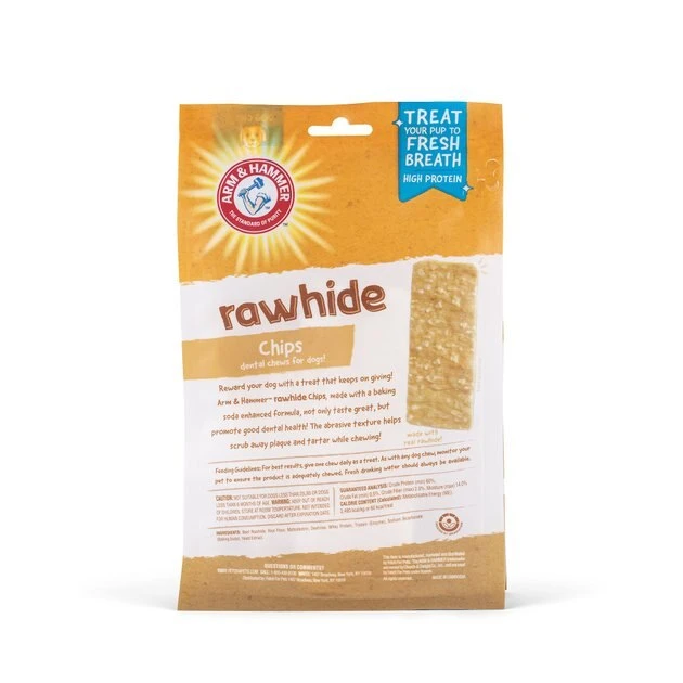 Keep your furry friend’s tail wagging, and his dental health in tiptop shape with Arm & Hammer Large Rawhide Chips Dog Treats. These treats combat bad breath on the spot with a great natural flavor, and real ingredients. The uncoated, real rawhide chips have an added Arm & Hammer baking soda formula that will help keep your pup’s teeth clean and white—while helping to remove bad breath odors as he chews and chews.