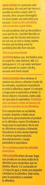 For pet accidents, blot up the problem area and let dry. Sprinkle liberally on carpet, wait 30 minutes and vacuum. Do not use on wet or damp carpets. Freshen pet bedding areas by sprinkling liberally then vacuum.