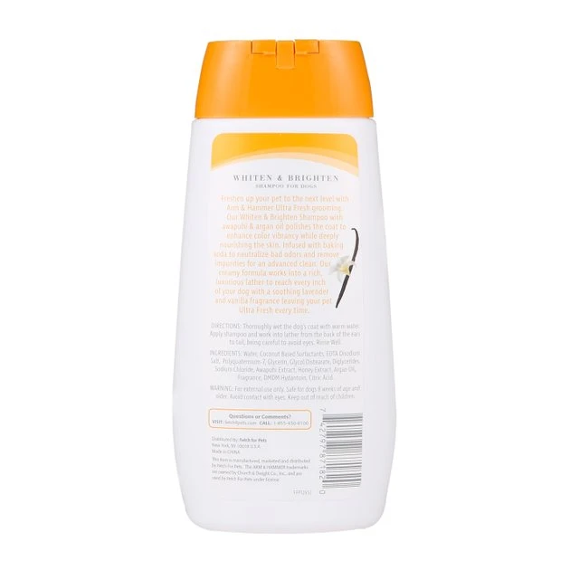 Restore your dog’s natural radiance with Arm and Hammer Pet Fresh Whiten and Brighten Lavender and Vanilla Dog Shampoo. This whitening shampoo helps wash away dirt and debris from your pal’s coat and bring out its true, shiny whites. The signature baking soda formula works to combat unwanted odors, and leaves behind a luxuriously soothing lavender and vanilla scent. Formulated to target dullness, use this natural and effective cleanser whenever you need to deodorize and brighten your dog’s coat—and maybe even his day!