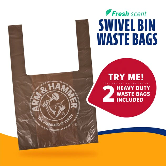 - Two bonus waste bags included that are infused with activated baking soda to neutralize odors and leave a fresh scent. Compatible with Arm & Hammer heavy duty waste bags.