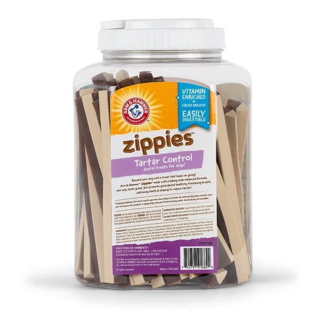 Dental hygiene has gotten a lot easier and yummier with Arm & Hammer Zippies Chicken Flavor Large Size Value Pack Dental Dog Treats. Flavored with delectable chicken, these baking soda-enhanced dental treats encourage cleaner teeth and fresher breath. Plus, they whiten and brighten teeth for a beautiful smile! Great for puppies and older dogs alike, give your favorite fur-iend a safe, gentle, and effective alternative to rawhide for even better oral hygiene.
