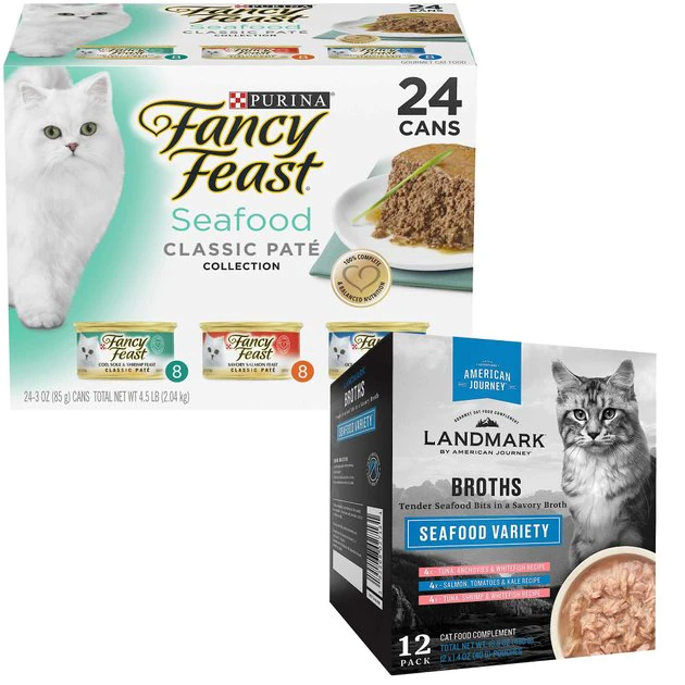 Indulge your cat with savory seafood from Fancy Feast Classic Seafood Feast Variety Pack Canned Food + American Journey Landmark Broths Seafood Variety Pack Wet Cat Food Complement Pouches. The Seafood Feast variety pack features a finely ground and delightfully smooth pate texture that will fill your cat’s belly with joy. Added vitamins and minerals offer complete and balanced nutrition, making every mealtime a nutritious and delicious occasion. Landmark Broths are a tasty, flavor-boosting topper purr-fect for everyday meals or as a special, satisfying treat. No matter how you serve them, your cat is bound to love the craveable seafood proteins in this variety pack—including salmon, tuna, anchovies, shrimp and whitefish. Plus, they’ll also get a boost of hydration to help keep them happy and healthy.