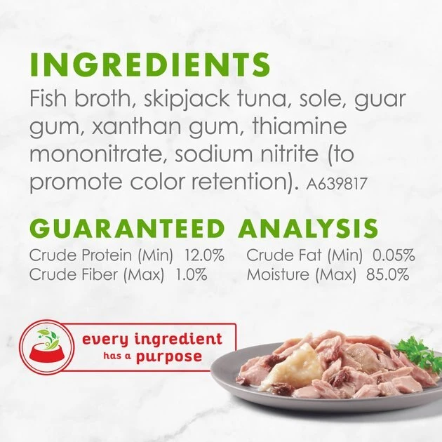 Fish Broth, Skipjack Tuna, Sole, Guar Gum, Xanthan Gum, Thiamine Mononitrate, Sodium Nitrite (to Promote Color Retention). A639817.