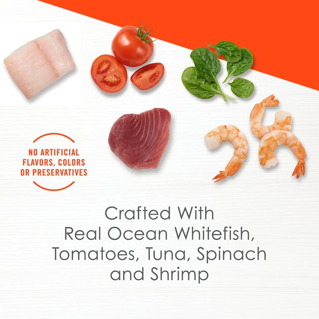 Fish Broth, Oceanfish, Shrimp, Tomatoes, Tuna, Fish Extract, Milk, Tapioca Starch, Spinach, Guar Gum, Xanthan Gum, Thaimine Mononitrate (Vitamin B-1).