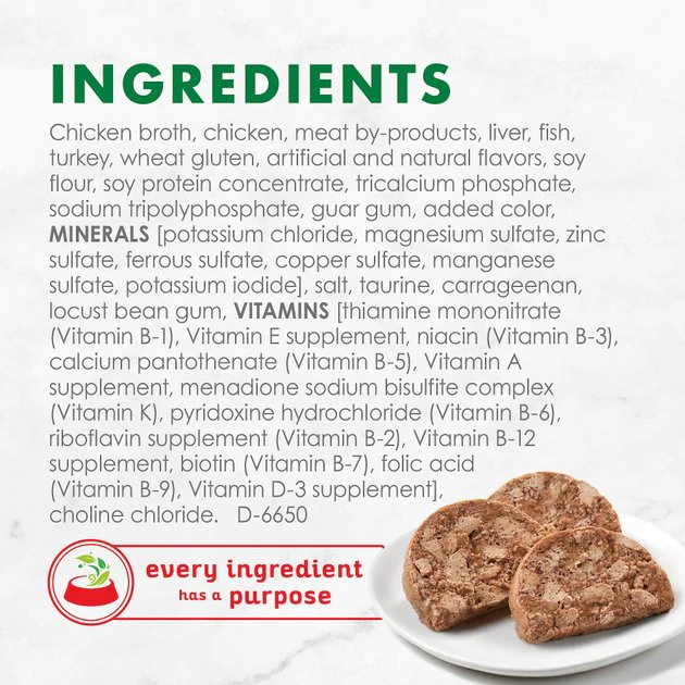 Chicken Broth, Chicken, Meat By-Products, Liver, Fish, Turkey, Wheat Gluten, Artificial And Natural Flavors, Soy Flour, Soy Protein Concentrate, Tricalcium Phosphate, Sodium Tripolyphosphate, Guar Gum, Added Color, Minerals [Potassium Chloride, Magnesium Sulfate, Zinc Sulfate, Ferrous Sulfate, Copper Sulfate, Manganese Sulfate, Potassium Iodide], Salt, Taurine, Carrageenan, Locust Bean Gum, Vitamins [Thiamine Mononitrate (Vitamin B-1), Vitamin E Supplement, Niacin (Vitamin B-3), Calcium Pantothenate (Vitamin B-5), Vitamin A Supplement, Menadione Sodium Bisulfite Complex (Vitamin K), Pyridoxine Hydrochloride (Vitamin B-6), Riboflavin Supplement (Vitamin B-2), Vitamin B-12 Supplement, Biotin (Vitamin B-7), Folic Acid (Vitamin B-9), Vitamin D-3 Supplement], Choline Chloride. D-6650.