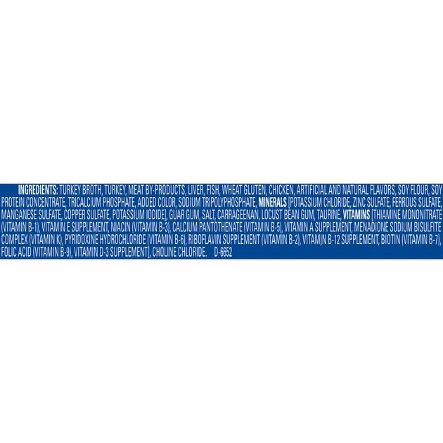 Turkey Broth, Turkey, Meat By-Products, Liver, Fish, Wheat Gluten, Chicken, Artificial And Natural Flavors, Soy Flour, Soy Protein Concentrate, Tricalcium Phosphate, Added Color, Sodium Tripolyphosphate, Minerals [Potassium Chloride, Zinc Sulfate, Ferrous Sulfate, Manganese Sulfate, Copper Sulfate, Potassium Iodide], Guar Gum, Salt, Carrageenan, Locust Bean Gum, Taurine, Vitamins [Thiamine Mononitrate (Vitamin B-1), Vitamin E Supplement, Niacin (Vitamin B-3), Calcium Pantothenate (Vitamin B-5), Vitamin A Supplement, Menadione Sodium Bisulfite Complex (Vitamin K), Pyridoxine Hydrochloride (Vitamin B-6), Riboflavin Supplement (Vitamin B-2), Vitamin B-12 Supplement, Biotin (Vitamin B-7), Folic Acid (Vitamin B-9), Vitamin D-3 Supplement], Choline Chloride. D-6652.