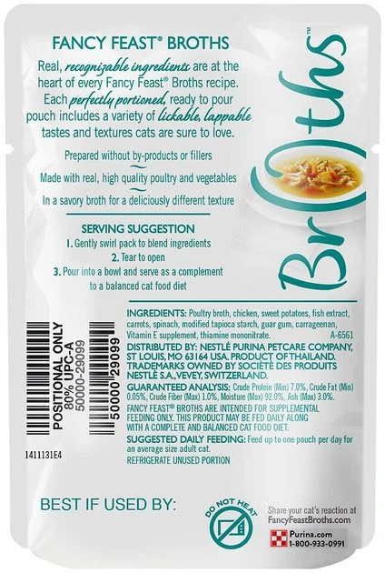 Fancy Feast Broths are intended for supplemental feeding only. This product may be fed daily along with a complete and balanced cat food diet. Feed up to 1 pouch per day for an average – size Adult cat.