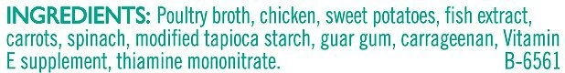 Poultry Broth, Chicken, Sweet Potatoes, Fish Extract, Carrots, Spinach, Modified Tapioca Starch, Guar Gum, Carrageenan, Vitamin E Supplement, Thiamine Mononitrate. B-6561.