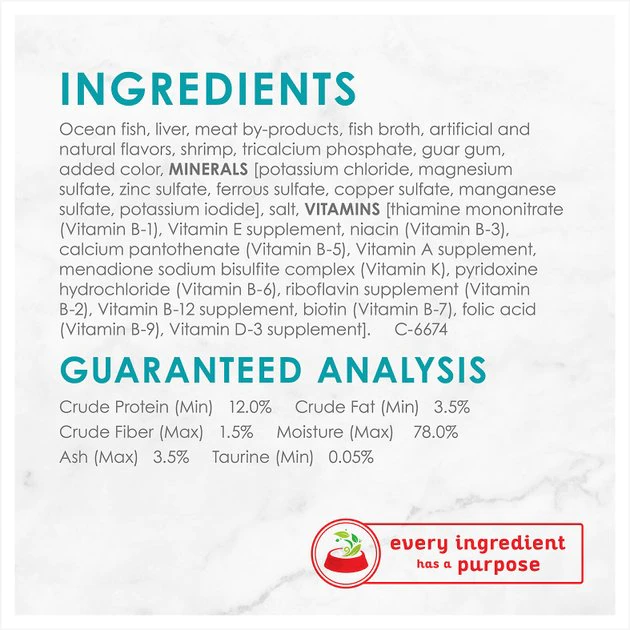 Ocean Fish, Liver, Meat By-Products, Fish Broth, Artificial and Natural Flavors, Shrimp, Tricalcium Phosphate, Guar Gum, Added Color, Minerals [Potassium Chloride, Magnesium Sulfate, Zinc Sulfate, Ferrous Sulfate, Copper Sulfate, Manganese Sulfate, Potassium Iodide], Salt, Vitamins [Thiamine Mononitrate (Vitamin B-1), Vitamin E Supplement, Niacin (Vitamin B-3), Calcium Pantothenate (Vitamin B-5), Vitamin A Supplement, Menadione Sodium Bisulfite Complex (Vitamin K), Pyridoxine Hydrochloride (Vitamin B-6), Riboflavin Supplement (Vitamin B-2), Vitamin B-12 Supplement, Biotin (Vitamin B-7), Folic Acid (Vitamin B-9), Vitamin D-3 Supplement].