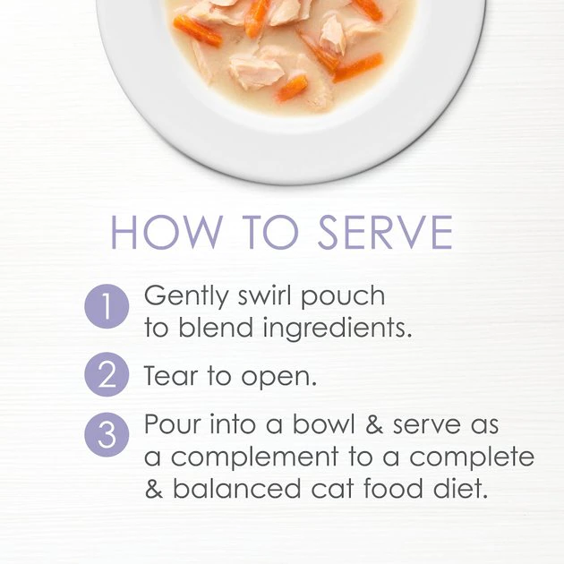 - Pour into a bowl and serve as a complement to a balanced cat food diet.