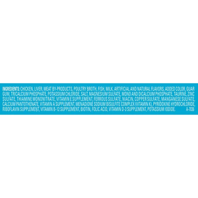 Chicken, Liver, Meat By-Products,Poultry Broth, Fish, Milk, Artificial and Natural Flavors, Added Color, Guar Gum, Tricalcium Phosphate, Potassium Chloride, Salt, Magnesium Sulfate, Mono and Dicalcium Phosphate, Taurine, Zinc Sulfate, Thiamine Mononitrate, Vitamin E Supplement, Ferrous Sulfate, Niacin, Copper Sulfate, Manganese Sulfate, Calcium Pantothenate, Vitamin A Supplement, Menadione Sodium Bisulfite Complex (Vitamin K), Pyridoxine Hydrochloride, Riboflavin Supplement, Vitamin B-12 Supplement, Biotin, Folic Acid, Vitamin D-3 Supplement, Potassium Iodide. A-7036.