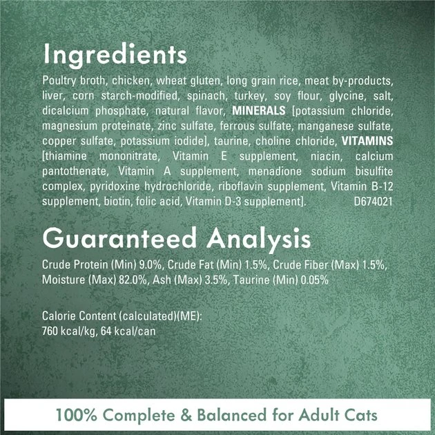 Poultry Broth, Chicken, Wheat Gluten, Long Grain Rice, Liver, Meat By-Products, Spinach, Corn Starch-Modified, Artificial And Natural Flavors, Turkey, Salt, Dicalcium Phosphate, Added Color, Soy Protein Concentrate, MINERALS [Potassium Chloride, Magnesium Sulfate, Zinc Sulfate, Ferrous Sulfate, Copper Sulfate, Manganese Sulfate, Potassium Iodide], Taurine, Choline Chloride, VITAMINS [Thiamine Mononitrate (Vitamin B-1), Vitamin E Supplement, Niacin (Vitamin B-3), Calcium Pantothenate (Vitamin B-5), Vitamin A Supplement, Menadione Sodium Bisulfite Complex (Vitamin K), Pyridoxine Hydrochloride (Vitamin B-6), Riboflavin Supplement (Vitamin B-2), Vitamin B-12 Supplement, Biotin (Vitamin B-7), Folic Acid (Vitamin B-9), Vitamin D-3 Supplement]. C-6740