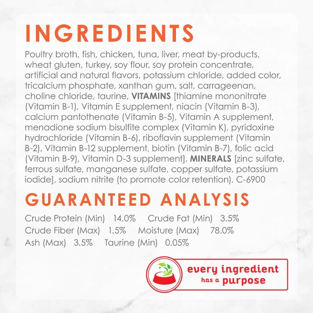 Poultry Broth, Fish, Chicken, Tuna, Liver, Meat By-Products, Wheat Gluten, Turkey, Soy Flour, Soy Protein Concentrate, Artificial And Natural Flavors, Potassium Chloride, Added Color, Tricalcium Phosphate, Xanthan Gum, Salt, Carrageenan, Choline Chloride, Taurine, Vitamins [Thiamine Mononitrate (Vitamin B-1), Vitamin E Supplement, Niacin (Vitamin B-3), Calcium Pantothenate (Vitamin B-5), Vitamin A Supplement, Menadione Sodium Bisulfite Complex (Vitamin K), Pyridoxine Hydrochloride (Vitamin B-6), Riboflavin Supplement (Vitamin B-2), Vitamin B-12 Supplement, Biotin (Vitamin B-7), Folic Acid (Vitamin B-9), Vitamin D-3 Supplement], Minerals [Zinc Sulfate, Ferrous Sulfate, Manganese Sulfate, Copper Sulfate, Potassium Iodide], Sodium Nitrite (To Promote Color Retention). C-6900.