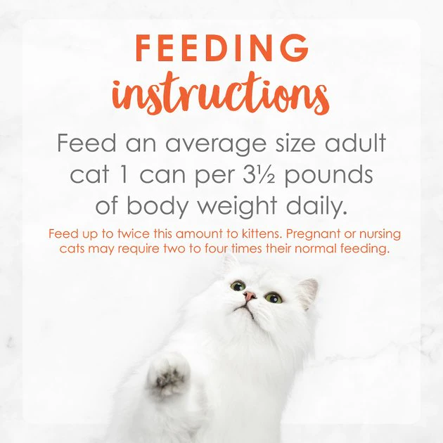 Feed an average size Adult cat 1 can per 3 1/2 lbs of body weight daily. Feed up to twice this amount to kittens. Pregnant or nursing cats may require 2 – 4 times their normal feeding.