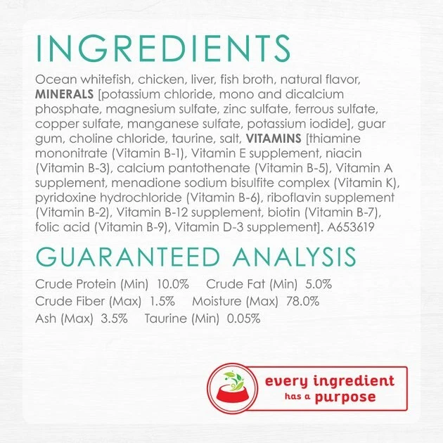 Ocean Whitefish, Chicken, Liver, Fish Broth, Natural Flavor, MINERALS [Potassium Chloride, Mono And Dicalcium Phosphate, Magnesium Sulfate, Zinc Sulfate, Ferrous Sulfate, Copper Sulfate, Manganese Sulfate, Potassium Iodide], Guar Gum, Choline Chloride, Taurine, Salt, VITAMINS [Thiamine Mononitrate (Vitamin B-1), Vitamin E Supplement, Niacin (Vitamin B-3), Calcium Pantothenate (Vitamin B-5), Vitamin A Supplement, Menadione Sodium Bisulfite Complex (Vitamin K), Pyridoxine Hydrochloride (Vitamin B-6), Riboflavin Supplement (Vitamin B-2), Vitamin B-12 Supplement, Biotin (Vitamin B-7), Folic Acid (Vitamin B-9), Vitamin D-3 Supplement]. A653619