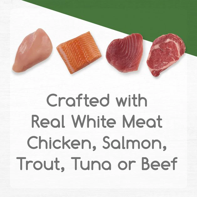 - Variety pack includes four natural recipes made with either real white meat chicken, beef, wild Alaskan salmon or trout and tuna.