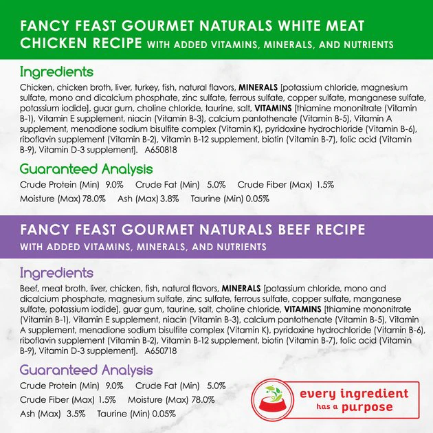 Chicken Recipe: Chicken, Chicken Broth, Liver, Turkey, Fish, Natural Flavors, Minerals [Potassium Chloride, Magnesium Sulfate, Mono And Dicalcium Phosphate, Zinc Sulfate, Ferrous Sulfate, Copper Sulfate, Manganese Sulfate, Potassium Iodide], Guar Gum, Choline Chloride, Taurine, Salt, Vitamins [Thiamine Mononitrate (Vitamin B-1), Vitamin E Supplement, Niacin (Vitamin B-3), Calcium Pantothenate (Vitamin B-5), Vitamin A Supplement, Menadione Sodium Bisulfite Complex (Vitamin K), Pyridoxine Hydrochloride (Vitamin B-6), Riboflavin Supplement (Vitamin B-2), Vitamin B-12 Supplement, Biotin (Vitamin B-7), Folic Acid (Vitamin B-9), Vitamin D-3 Supplement].