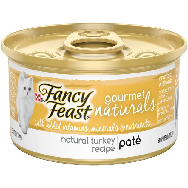 Make tonight’s meal an elegant experience with Fancy Feast’s Gourmet Naturals Natural Turkey Recipe Pate Canned Cat Food. Even the choosiest kitties can’t resist the sumptuous poultry flavor in this deliciously posh pate. Made without any grain, corn, soy or poultry by-products, this natural moist diet is fortified with the vitamins, minerals and essential nutrients your fabulous feline needs. Masterfully crafted with the taste you expect from Fancy Feast, this complete and balanced diet will provide your kitty with the nutrition she needs in a flavor she’ll adore.