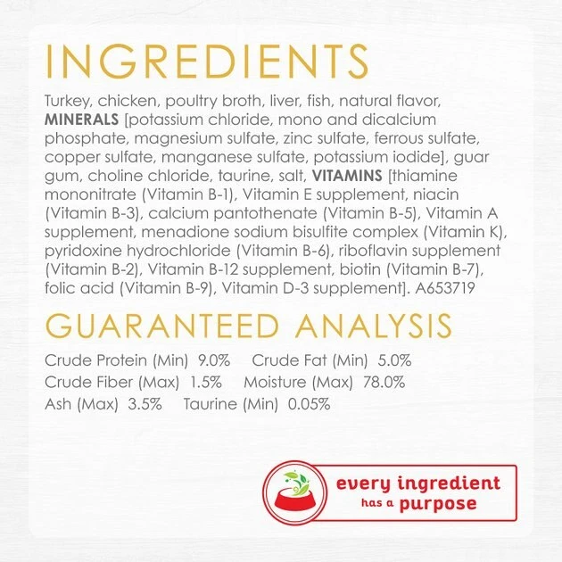 Turkey, Chicken, Poultry Broth, Liver, Fish, Natural Flavor, MINERALS [Potassium Chloride, Mono And Dicalcium Phosphate, Magnesium Sulfate, Zinc Sulfate, Ferrous Sulfate, Copper Sulfate, Manganese Sulfate, Potassium Iodide], Guar Gum, Choline Chloride, Taurine, Salt, VITAMINS [Thiamine Mononitrate (Vitamin B-1), Vitamin E Supplement, Niacin (Vitamin B-3), Calcium Pantothenate (Vitamin B-5), Vitamin A Supplement, Menadione Sodium Bisulfite Complex (Vitamin K), Pyridoxine Hydrochloride (Vitamin B-6), Riboflavin Supplement (Vitamin B-2), Vitamin B-12 Supplement, Biotin (Vitamin B-7), Folic Acid (Vitamin B-9), Vitamin D-3 Supplement]. A653719
