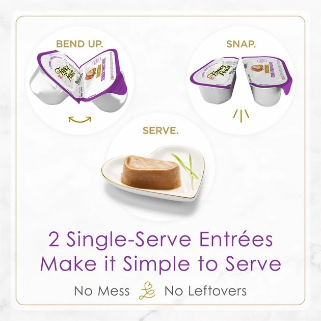 - Each single-serve wet cat food tray breaks in half for the perfect size serving with no mess and no leftovers.