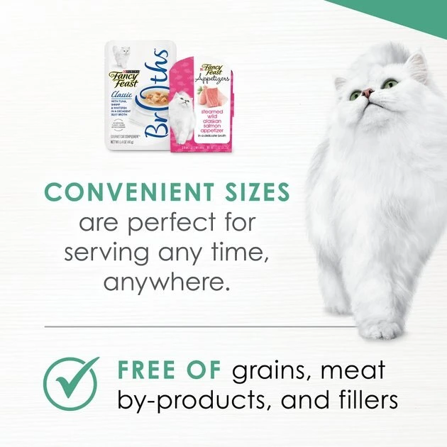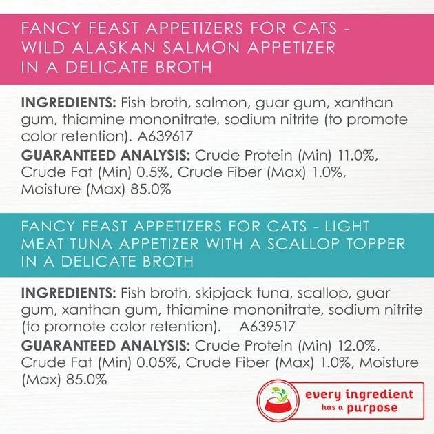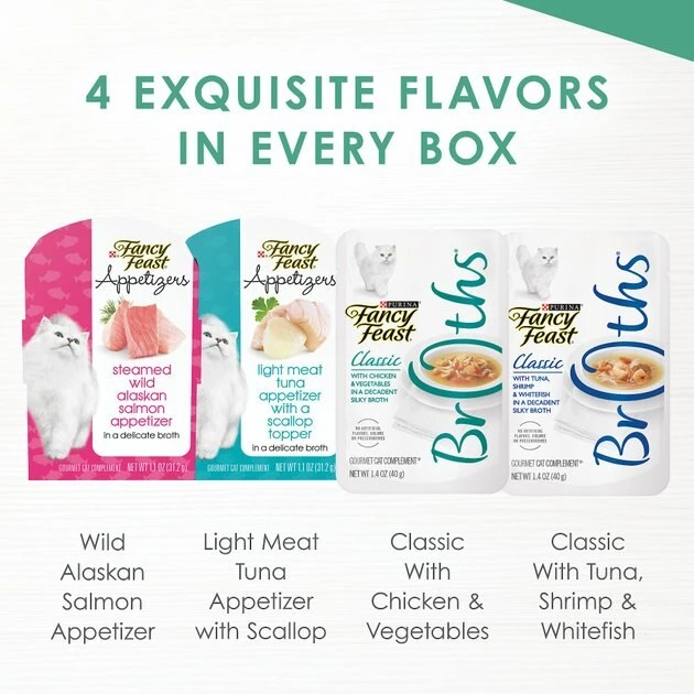 - Let your furry pal enjoy the gourmet taste and texture she adores with two Fancy Feast Appetizers and two Fancy Feast Broths varieties.