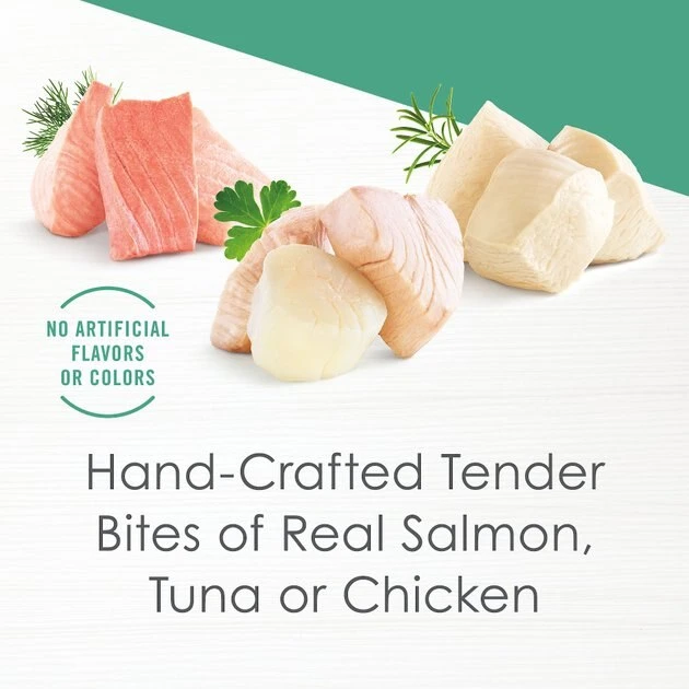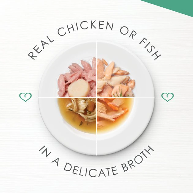 - Handcrafted tender bites of real chicken or fish are served in a delicate broth to give your furry companion moments of pure bliss.