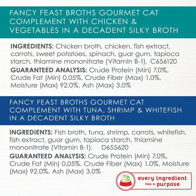Fancy Feast Broths are intended for supplemental feeding only. This product may be fed daily along with a complete and balanced cat food diet.