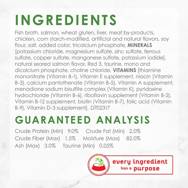 Fish Broth, Salmon, Liver, Wheat Gluten, Meat By-Products, Corn Starch-Modified, Chicken, Artificial and Natural Flavors, Soy Flour, Added Color (Red 3 and Other Color), Salt, Calcium Phosphate, Potassium Chloride, Natural Seared Salmon Flavor, Taurine, Magnesium Sulfate, Choline Chloride, Thiamine Mononitrate, Vitamin E Supplement, Zinc Sulfate, Ferrous Sulfate, Niacin, Calcium Pantothenate, Copper Sulfate, Vitamin A Supplement, Manganese Sulfate, Menadione Sodium Bisulfite Complex (Source of Vitamin K Activity), Pyridoxine Hydrochloride, Riboflavin Supplement, Vitamin B-12 Supplement, Biotin, Folic Acid, Vitamin D-3 Supplement, Potassium Iodide.