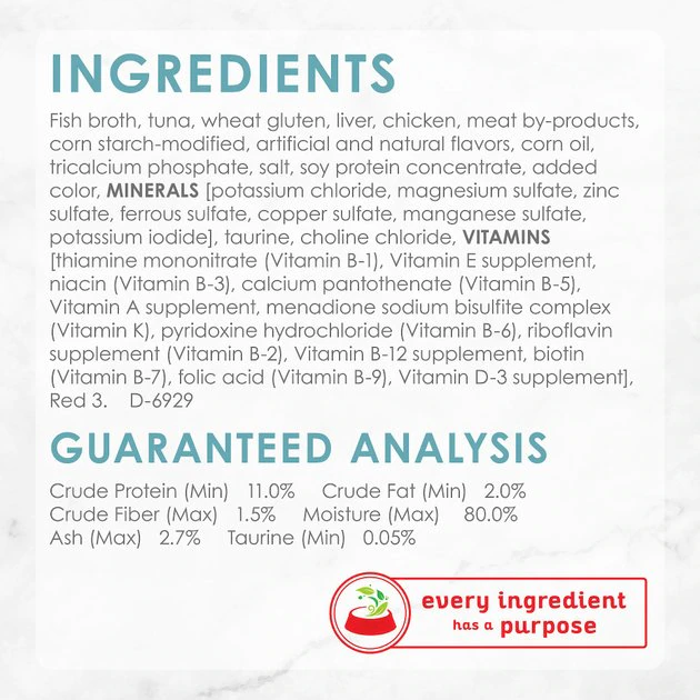 Fish Broth, Tuna, Wheat Gluten, Liver, Chicken, Meat By-Products, Corn Starch-Modified, Artificial and Natural Flavors, Corn Oil, Tricalcium Phosphate, Salt, Soy Protein Concentrate, Added Color, Minerals [Potassium Chloride, Magnesium Sulfate, Zinc Sulfate, Ferrous Sulfate, Copper Sulfate, Manganese Sulfate, Potassium Iodide], Taurine, Choline Chloride, Vitamins [Thiamine Mononitrate (Vitamin B-1), Vitamin E Supplement, Niacin (Vitamin B-3), Calcium Pantothenate (Vitamin B-5), Vitamin A Supplement, Menadione Sodium Bisulfite Complex (Vitamin K), Pyridoxine Hydrochloride (Vitamin B-6), Riboflavin Supplement (Vitamin B-2), Vitamin B-12 Supplement, Biotin (Vitamin B-7), Folic Acid (Vitamin B-9), Vitamin D-3 Supplement], Red 3. D-6929.