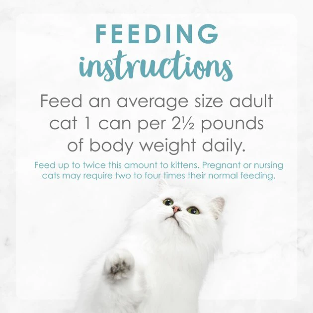 Feed an average size Adult cat 1 can per 2 1/2 lbs of body weight daily. Feed up to twice this amount to kittens. Pregnant or nursing cats may require 2 – 4 times their normal feeding.