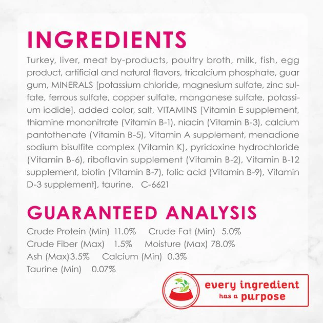 Turkey, Liver, Meat By-Products, Poultry Broth, Milk, Fish, Egg Product, Artificial and Natural Flavors, Tricalcium Phosphate, Guar Gum, Minerals [Potassium Chloride, Magnesium Sulfate, Zinc Sulfate, Ferrous Sulfate, Copper Sulfate, Manganese Sulfate, Potassium Iodide], Added Color, Salt, Vitamins [Vitamin E Supplement, Thiamine Mononitrate (Vitamin B-1), Niacin (Vitamin B-3), Calcium Pantothenate (Vitamin B-5), Vitamin A Supplement, Menadione Sodium Bisulfite Complex (Vitamin K), Pyridoxine Hydrochloride (Vitamin B-6), Riboflavin Supplement (Vitamin B-2), Vitamin B-12 Supplement, Biotin (Vitamin B-7), Folic Acid (Vitamin B-9), Vitamin D-3 Supplement], Taurine. C-6621.