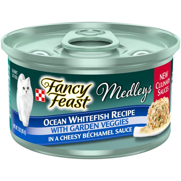 My cat absolutely loves this Fancy Feast Medleys Ocean Whitefish Recipe! The addition of garden veggies and cheesy bechamel sauce makes it a gourmet treat. I appreciate the high-quality ingredients and the convenience of buying it in a case of 24.