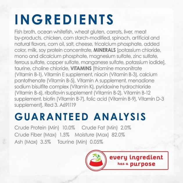 Fish Broth, Ocean Whitefish, Wheat Gluten, Carrots, Liver, Meat By-Products, Chicken, Corn Starch-Modified, Spinach, Artificial And Natural Flavors, Corn Oil, Salt, Cheese, Tricalcium Phosphate, Added Color, Milk, Soy Protein Concentrate, MINERALS [Potassium Chloride, Mono And Dicalcium Phosphate, Magnesium Sulfate, Zinc Sulfate, Ferrous Sulfate, Copper Sulfate, Manganese Sulfate, Potassium Iodide], Taurine, Choline Chloride, VITAMINS [Thiamine Mononitrate (Vitamin B-1), Vitamin E Supplement, Niacin (Vitamin B-3), Calcium Pantothenate (Vitamin B-5), Vitamin A Supplement, Menadione Sodium Bisulfite Complex (Vitamin K), Pyridoxine Hydrochloride (Vitamin B-6), Riboflavin Supplement (Vitamin B-2), Vitamin B-12 Supplement, Biotin (Vitamin B-7), Folic Acid (Vitamin B-9), Vitamin D-3 Supplement], Red 3. A691119