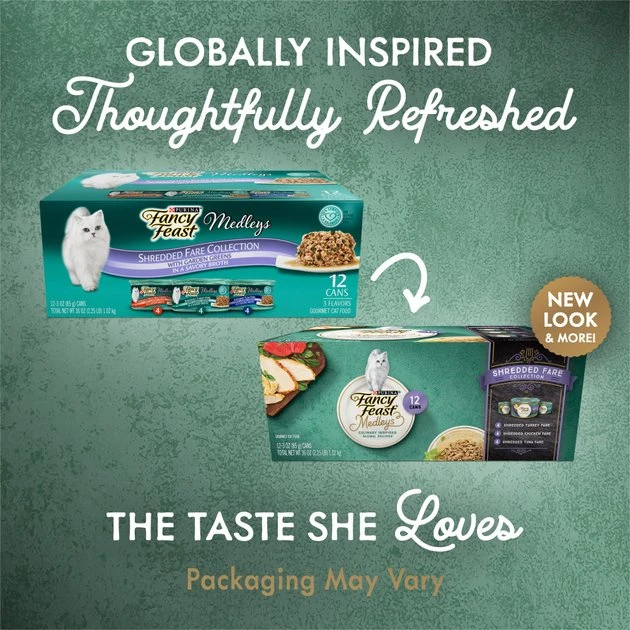 - Canned cat food shreds crafted with real, high-quality ingredients, featuring chicken, tuna or turkey with spinach in a Fancy Feast broth.