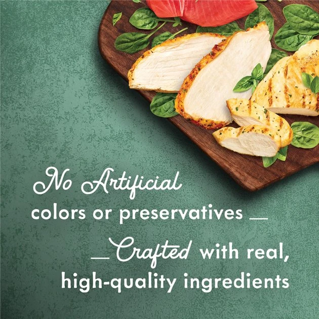 - Same exceptional Fancy Feast canned cat food chicken, turkey or tuna taste experience, but without any artificial colors and preservatives.