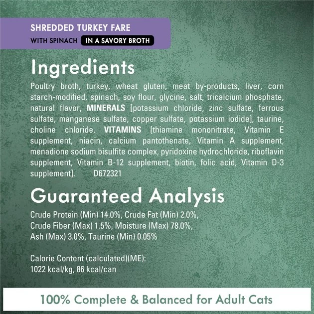 Fancy Feast Medleys Shredded Turkey Fare: Poultry Broth, Turkey, Wheat Gluten, Meat By-Products, Liver, Corn Starch-Modified, Spinach, Soy Flour, Glycine, Salt, Tricalcium Phosphate, Natural Flavor, MINERALS (Potassium Chloride, Zinc Sulfate, Ferrous Sulfate, Manganese Sulfate, Copper Sulfate, Potassium Iodide), Taurine, Choline Chloride, VITAMINS (Thiamine Mononitrate, Vitamin E Supplement, Niacin, Calcium Pantothenate, Vitamin A Supplement, Menadione Sodium Bisulfite Complex, Pyridoxine Hydrochloride, Riboflavin Supplement, Vitamin B-12 Supplement, Biotin, Folic Acid, Vitamin D-3 Supplement). D672321