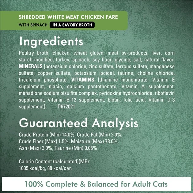 Fancy Feast Medleys Shredded White Meat Chicken Fare: Poultry Broth, Chicken, Wheat Gluten, Meat By-Products, Liver, Corn Starch-Modified, Turkey, Spinach, Soy Flour, Glycine, Salt, Natural Flavor, MINERALS (Potassium Chloride, Zinc Sulfate, Ferrous Sulfate, Manganese Sulfate, Copper Sulfate, Potassium Iodide), Taurine, Choline Chloride, Tricalcium Phosphate, VITAMINS (Thiamine Mononitrate, Vitamin E Supplement, Niacin, Calcium Pantothenate, Vitamin A Supplement, Menadione Sodium Bisulfite Complex, Pyridoxine Hydrochloride, Riboflavin Supplement, Vitamin B-12 Supplement, Biotin, Folic Acid, Vitamin D-3 Supplement). D672021.