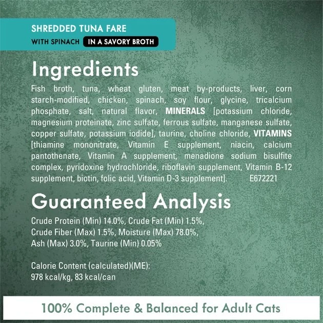 Fancy Feast Medleys Shredded Tuna Fare: Fish Broth, Tuna, Wheat Gluten, Meat By-Products, Liver, Corn Starch-Modified, Chicken, Spinach, Soy Flour, Glycine, Tricalcium Phosphate, Salt, Natural Flavor, MINERALS (Potassium Chloride, Magnesium Proteinate, Zinc Sulfate, Ferrous Sulfate, Manganese Sulfate, Copper Sulfate, Potassium Iodide), Taurine, Choline Chloride, VITAMINS (Thiamine Mononitrate, Vitamin E Supplement, Niacin, Calcium Pantothenate, Vitamin A Supplement, Menadione Sodium Bisulfite Complex, Pyridoxine Hydrochloride, Riboflavin Supplement, Vitamin B-12 Supplement, Biotin, Folic Acid, Vitamin D-3 Supplement).E672221