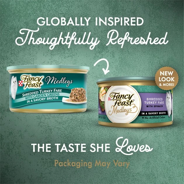 Delight your cat with Purina Fancy Feast Canned Cat Food Medleys Shredded Turkey Fare with Spinach in a broth for cats. This Fancy Feast cat food features real turkey and spinach in a delicious cat broth. Crafted in partnership with our expert chefs and nutritionists, each Fancy Feast Medleys broth cat food recipe features combinations inspired by dishes from around the world. This 100% complete and balanced formula for adult cats without any artificial colors or preservatives provides your cat with the nutrition they need. Watch your cat scamper each time you open a can of Fancy Feast Purina wet cat food. For cats who love meals with different flavors and textures, sample our other Fancy Feast Medleys varieties of wet food for cats.
