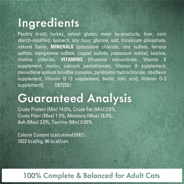 Poultry Broth, Turkey, Wheat Gluten, Liver, Meat By-Products, Spinach, Corn Starch-Modified, Artificial and Natural Flavors, Tricalcium Phosphate, Salt, Soy Protein Concentrate, Added Color, Potassium Chloride, Taurine, Choline Chloride, Magnesium Sulfate, Thiamine Mononitrate, Vitamin E Supplement, Zinc Sulfate, Ferrous Sulfate, Niacin, Calcium Pantothenate, Vitamin A Supplement, Menadione, Sodium Bisulfite Complex (Source of Vitamin K Activity), Copper Sulfate, Manganese Sulfate, Pyridoxine Hydrochloride, Riboflavin Supplement, Vitamin B-12 Supplement, Biotin, Folic Acid, Vitamin D-3 Supplement, Potassium Iodide. B-6723.