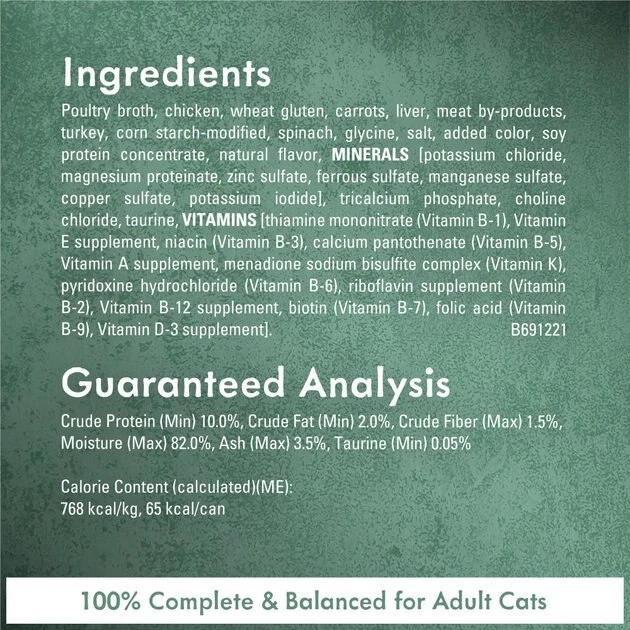 Poultry Broth, Chicken, Wheat Gluten, Carrots, Liver, Meat By-Products, Turkey, Corn Starch-Modified, Spinach, Artificial And Natural Flavors, Salt, Added Color, Tricalcium Phosphate, Soy Protein Concentrate, MINERALS [Potassium Chloride, Mono And Dicalcium Phosphate, Magnesium Sulfate, Zinc Sulfate, Ferrous Sulfate, Copper Sulfate, Manganese Sulfate, Potassium Iodide], Choline Chloride, Taurine, VITAMINS [Thiamine Mononitrate (Vitamin B-1), Vitamin E Supplement, Niacin (Vitamin B-3), Calcium Pantothenate (Vitamin B-5), Vitamin A Supplement, Menadione Sodium Bisulfite Complex (Vitamin K), Pyridoxine Hydrochloride (Vitamin B-6), Riboflavin Supplement (Vitamin B-2), Vitamin B-12 Supplement, Biotin (Vitamin B-7), Folic Acid (Vitamin B-9), Vitamin D-3 Supplement]. A691219