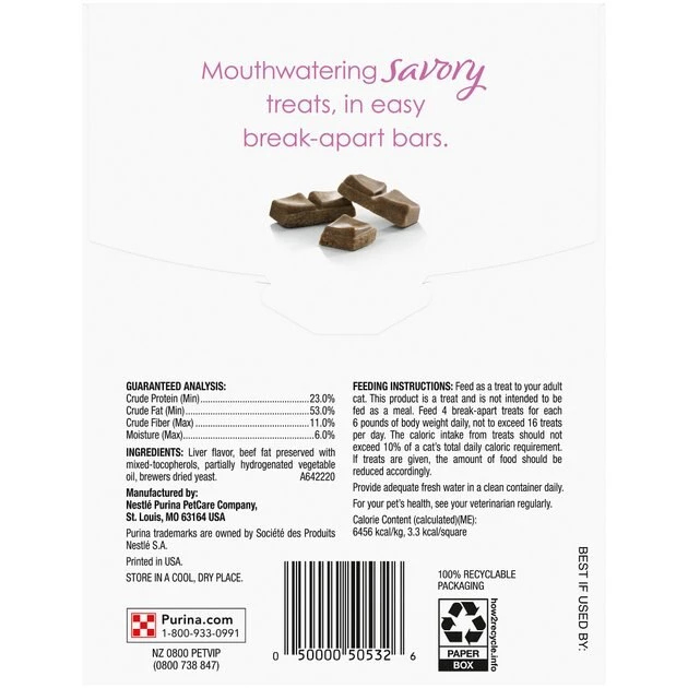 - Each limited-ingredient cat treat breaks into bite-sized pieces with eight break-apart squares in each serving.