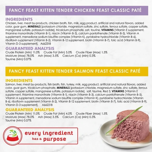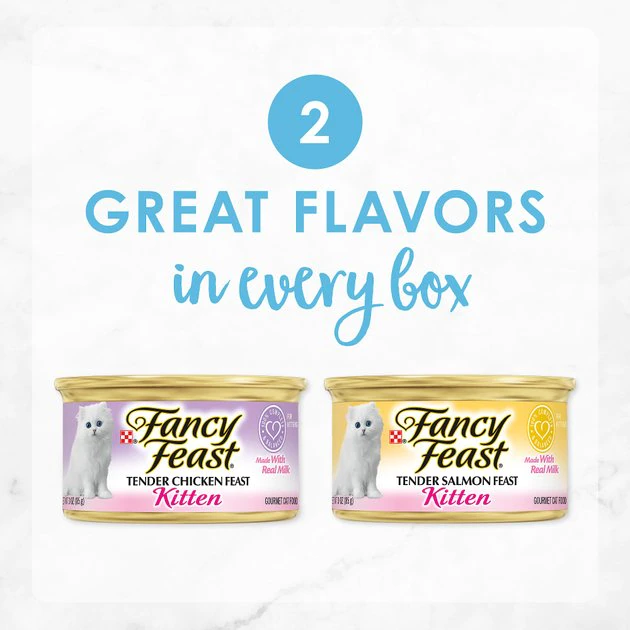 Give your growing kitten more of the mouthwatering entrees she loves with this Fancy Feast Tender Feast Kitten Variety Pack Canned Cat Food. Each recipe features chicken or salmon as the #1 ingredient, along with real milk and other high-quality ingredients. Essential vitamins and minerals help support your kitten’s health, and the smooth pate texture is easy for her to eat, giving her a delectable taste with every bite. This wholesome wet kitten food provides 100% complete and balanced nutrition, so you know she’s getting the nutrition she needs to help her grow up strong and healthy. These delicious recipes are packaged in convenient pull-tab cans for easy serving. While she gets a gourmet dining experience, you get the comfort that comes from knowing your growing kitten is getting high-quality entrees backed by Purina’s 95 years of innovation.