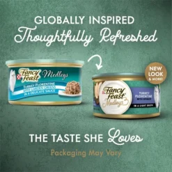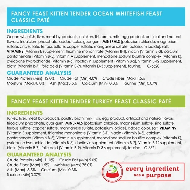 Give your growing kitten more of the mouthwatering entrees she loves with this Fancy Feast Tender Feast Kitten cat food variety pack. Each recipe features poultry or fish as the #1 ingredient, along with real milk and other high-quality ingredients. Essential vitamins and minerals help support your kitten’s health, and the smooth pate texture is easy for her to eat, giving her a delectable taste with every bite. This wholesome wet kitten food provides 100% complete and balanced nutrition, so you know she’s getting the nutrition she needs to help her grow up strong and healthy. These delicious recipes are packaged in convenient pull-tab cans for easy serving. While she gets a gourmet dining experience, you get the comfort that comes from knowing your growing kitten is getting high-quality entrees backed by Purina’s 95 years of innovation.