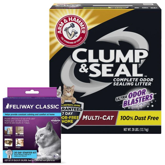 Create a calm and clean purr-adise for your kitty with the Feliway Classic 30 Day Starter Kit Calming Diffuser for Cats + Arm & Hammer Litter Clump & Seal Multi-Cat Scented Clumping Clay Litter. By mimicking your cat’s natural facial pheromones, Feliway creates a state of familiarity and security in your cat’s surroundings. As a result, Feliway can be used to help comfort and reassure your cat while he copes with a challenging situation and help prevent or reduce the stress caused by a change in his environment. Meanwhile, the litter is specially formulated for seven days of odor protection for multi-cat households. A proprietary blend of moisture-activated micro-granules seals in odor, while Arm & Hammer baking soda destroys the odors on contact. Best of all, not only will your house stay smelling so fresh and so clean, but the ultra-low dust strong clumping formula makes clean-up especially easy.