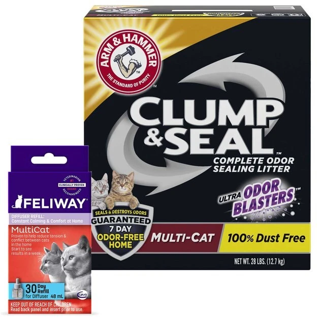 Keep your kitty feeling calm and clean with Feliway MultiCat Calming Diffuser Refill for Cats, 1 count + Arm & Hammer Litter Clump & Seal Multi-Cat Scented Clumping Clay Litter. When a cat has kittens, she releases natural, calming pheromones as her kittens start to nurse. This refill is designed to work with the Feliway MultiCat Diffuser (sold separately), and it’s a synthetic copy of that pheromone. By mimicking this bonding pheromone, Feliway creates a state of calmness and comfort to alleviate tension and conflict between cats. Meanwhile, the litter is specially formulated for seven days of odor protection for multi-cat households. A proprietary blend of moisture-activated micro-granules seals in odor, while Arm & Hammer baking soda destroys the odors on contact. Best of all, not only will your house stay smelling so fresh and so clean, but the ultra-low dust strong clumping formula makes clean-up especially easy.