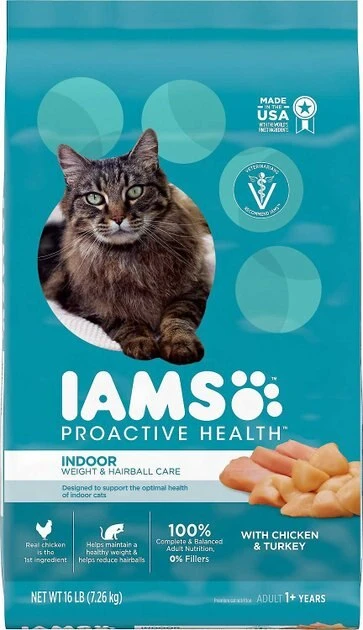 - Iams ProActive Health Indoor Weight & Hairball Care Dry Cat Food is made in the USA.