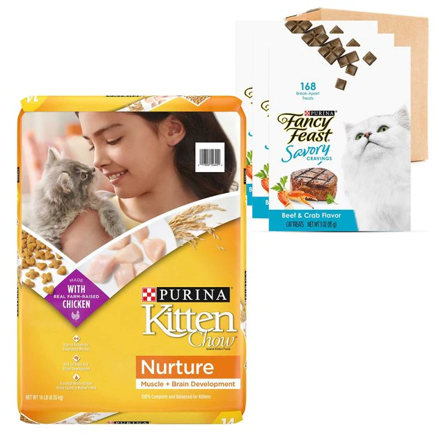 - Each purchase comes with Kitten Chow Nurture Muscle & Brain Development Dry Cat Food, 14-lb bag & Fancy Feast Savory Cravings Limited Ingredient Beef & Crab Flavor Cat Treats, 3-oz box, case of 3.