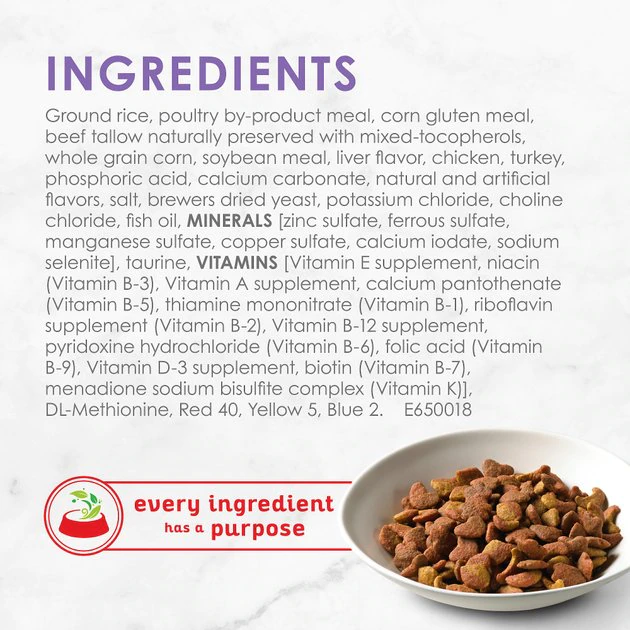 Ground Rice, Poultry By-Product Meal, Corn Gluten Meal, Beef Tallow Naturally Preserved With Mixed-Tocopherols, Whole Grain Corn, Soybean Meal, Liver Flavor, Chicken, Turkey, Phosphoric Acid, Calcium Carbonate, Natural And Artificial Flavors, Salt, Brewers Dried Yeast, Potassium Chloride, Choline Chloride, Fish Oil, Minerals [Zinc Sulfate, Ferrous Sulfate, Manganese Sulfate, Copper Sulfate, Calcium Iodate, Sodium Selenite], Taurine, Vitamins [Vitamin E Supplement, Niacin (Vitamin B-3), Vitamin A Supplement, Calcium Pantothenate (Vitamin B-5), Thiamine Mononitrate (Vitamin B-1), Riboflavin Supplement (Vitamin B-2), Vitamin B-12 Supplement, Pyridoxine Hydrochloride (Vitamin B-6), Folic Acid (Vitamin B-9), Vitamin D-3 Supplement, Biotin (Vitamin B-7), Menadione Sodium Bisulfite Complex (Vitamin K)], Dl-Methionine, Red 40, Yellow 5, Blue 2. E650018